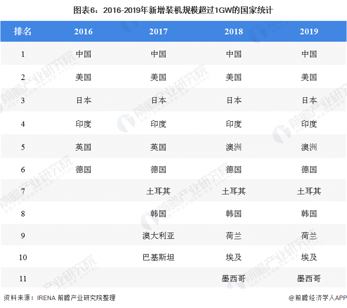 根據(jù)國際可再生能源機(jī)構(gòu)(IRENA)數(shù)據(jù)顯示,2019年全球主要光伏發(fā)電國家新增光伏裝機(jī)容量超過1GW的國家有11個(gè),較2016年增加5個(gè)。