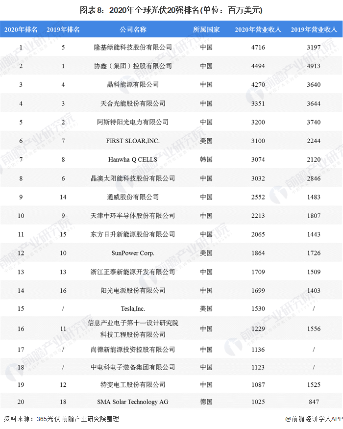 根據(jù)365光伏發(fā)布的“2020全球光伏企業(yè)20強(qiáng)排行榜”榜單顯示,隆基綠能科技股份有限公司、協(xié)鑫(集團(tuán))控股有限公司、晶科能源有限公司、天合光能股份有限公司、阿斯特陽光電力有限公司、FIRST SLOAR,INC.、Hanwha Q CELLS、晶澳太陽能科技股份有限公司、通威股份有限公司、天津中環(huán)半導(dǎo)體股份有限公司進(jìn)入前十。中國企業(yè)已經(jīng)連續(xù)兩年占據(jù)榜單前五強(qiáng),其中,隆基綠能科技股份有限公司以營收4716百萬美元位居榜首。