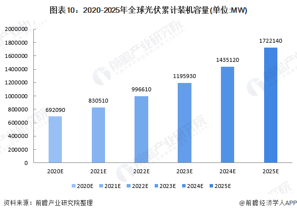 隨著多年來的研究和技術(shù)開發(fā),太陽能光伏組件價(jià)格已大幅下降,且太陽能轉(zhuǎn)化效率也得以提高使得太陽能光伏發(fā)電的商業(yè)化開發(fā)與應(yīng)用成為可能。前瞻產(chǎn)業(yè)研究院結(jié)合當(dāng)前全球各國的可再生能源政策以及光伏發(fā)電補(bǔ)貼、上網(wǎng)政策綜合分析,預(yù)計(jì)在未來的一段時(shí)間,全球光伏累計(jì)裝機(jī)容量還將會繼續(xù)保持增長,預(yù)計(jì)2025年將會突破1700GW。