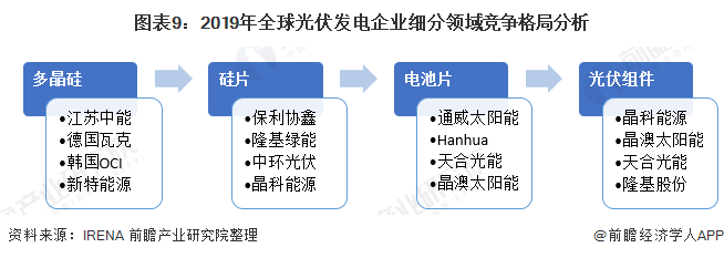 分細(xì)分領(lǐng)域來看,在多晶硅領(lǐng)域江蘇中能、德國瓦克、韓國OCI和新特能源是該領(lǐng)域的代表性企業(yè);硅片領(lǐng)域中保利協(xié)鑫、隆基綠能、中環(huán)光伏和晶科能源位于行業(yè)前列;電池片領(lǐng)域中通威太陽能、Hanhua、天合光能和晶澳太陽能處于行業(yè)領(lǐng)先;在光伏組件領(lǐng)域,晶科能源、晶澳太陽能、天合光能以及隆基股份競爭力較強(qiáng)。