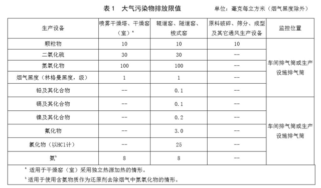 《排放標(biāo)準(zhǔn)》規(guī)定了陶瓷工業(yè)企業(yè)或生產(chǎn)設(shè)施的大氣污染物排放限值及控制要求、大氣污染物監(jiān)測、達標(biāo) 判定要求和實施與監(jiān)督。