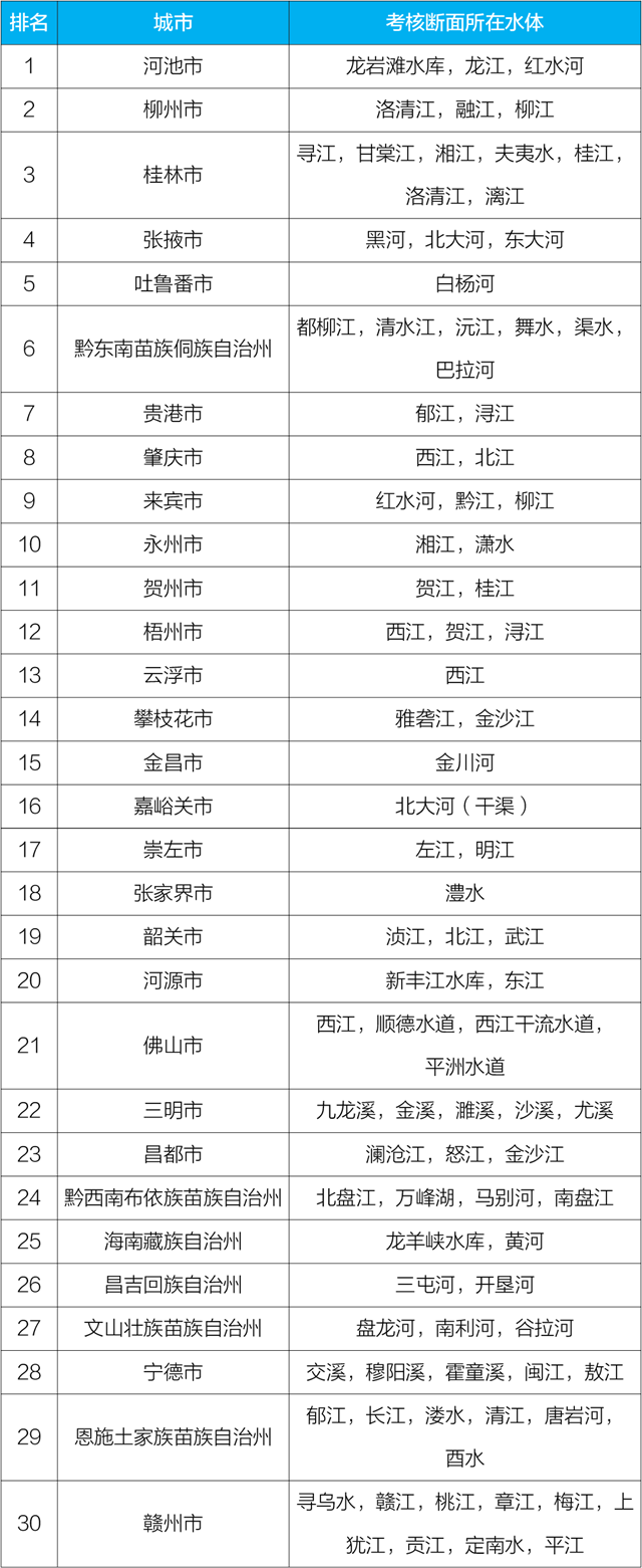 2020年7月國家地表水考核斷面水環(huán)境質(zhì)量狀況排名前30位城市及所在水體