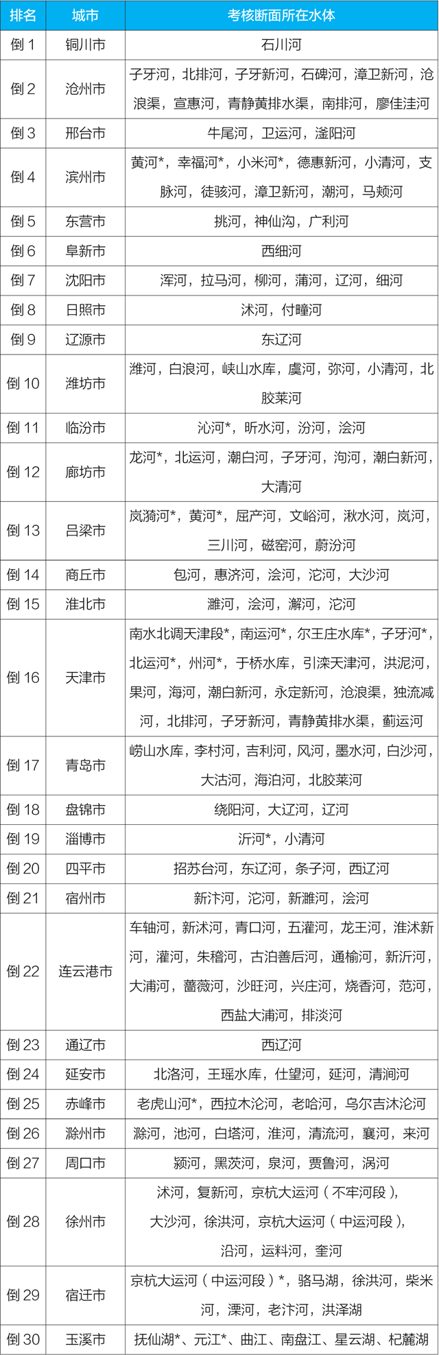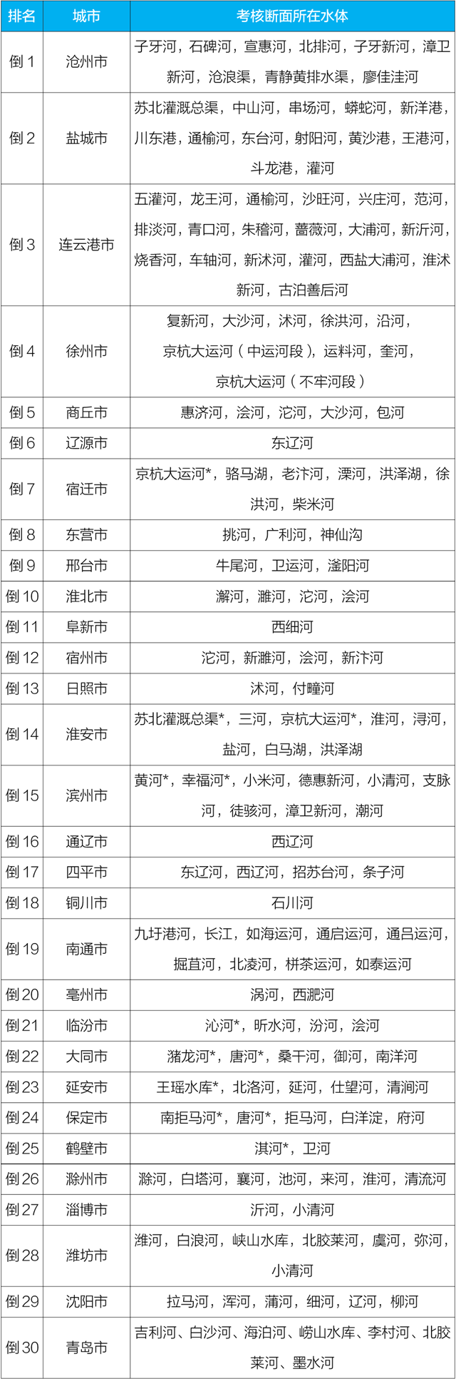 2020年7月國家地表水考核斷面水環(huán)境質(zhì)量狀況排名后30位城市及所在水體