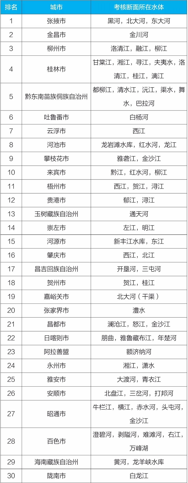 參加排名的全國地級及以上城市,覆蓋2050個國控斷面(其中1940個為國家地表水考核斷面,110個為入海控制斷面)。7月,全國地級及以上城市中,河池、柳州、桂林等30個城市國家地表水考核斷面水環(huán)境質(zhì)量相對較好(從第1名至第30名),滄州、鹽城、連云港等30個城市國家地表水考核斷面水環(huán)境質(zhì)量相對較差(從倒數(shù)第1名至倒數(shù)第30名);1-7月,全國地級及以上城市中,張掖、金昌、柳州等30個城市國家地表水考核斷面水環(huán)境質(zhì)量相對較好(從第1名至第30名),銅川、滄州、邢臺等30個城市國家地表水考核斷面水環(huán)境質(zhì)量相對較差(從倒數(shù)第1名至倒數(shù)第30名)。詳細見附表1~附表4。