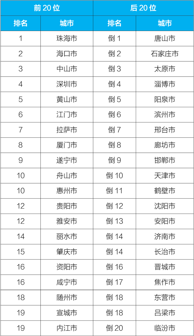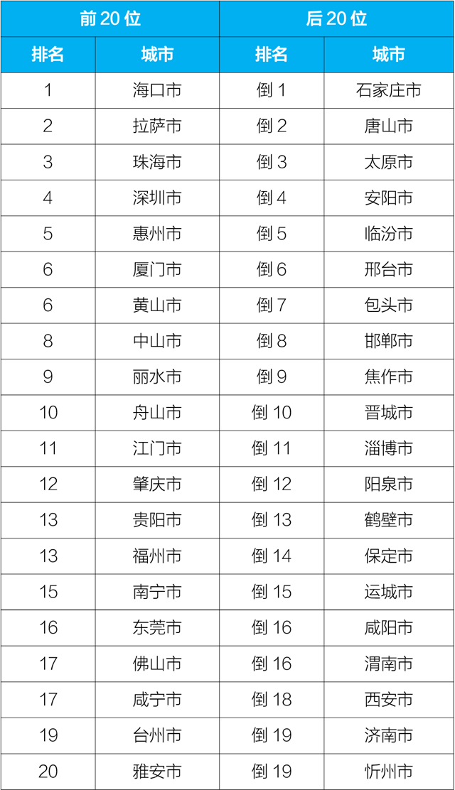 1-7月,168個重點城市中石家莊、唐山和太原市等城市空氣質(zhì)量相對較差(從倒數(shù)第1名至并列倒數(shù)第19名);???、拉薩、珠海市等城市空氣質(zhì)量相對較好(從第1名至第20名,見附表6)。