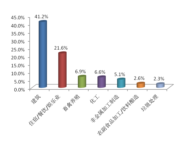 從行業(yè)類(lèi)型來(lái)看,7月公眾反映最集中的行業(yè)為建筑業(yè),占41.2%,其次為住宿餐飲娛樂(lè)業(yè)和畜禽養(yǎng)殖業(yè),分別占21.6%和6.9%。其中,建筑業(yè)、住宿餐飲娛樂(lè)業(yè)舉報(bào)占比環(huán)比分別上升0.8個(gè)百分點(diǎn)和1.1個(gè)百分點(diǎn),畜禽養(yǎng)殖業(yè)舉報(bào)占比環(huán)比下降0.2個(gè)百分點(diǎn)。