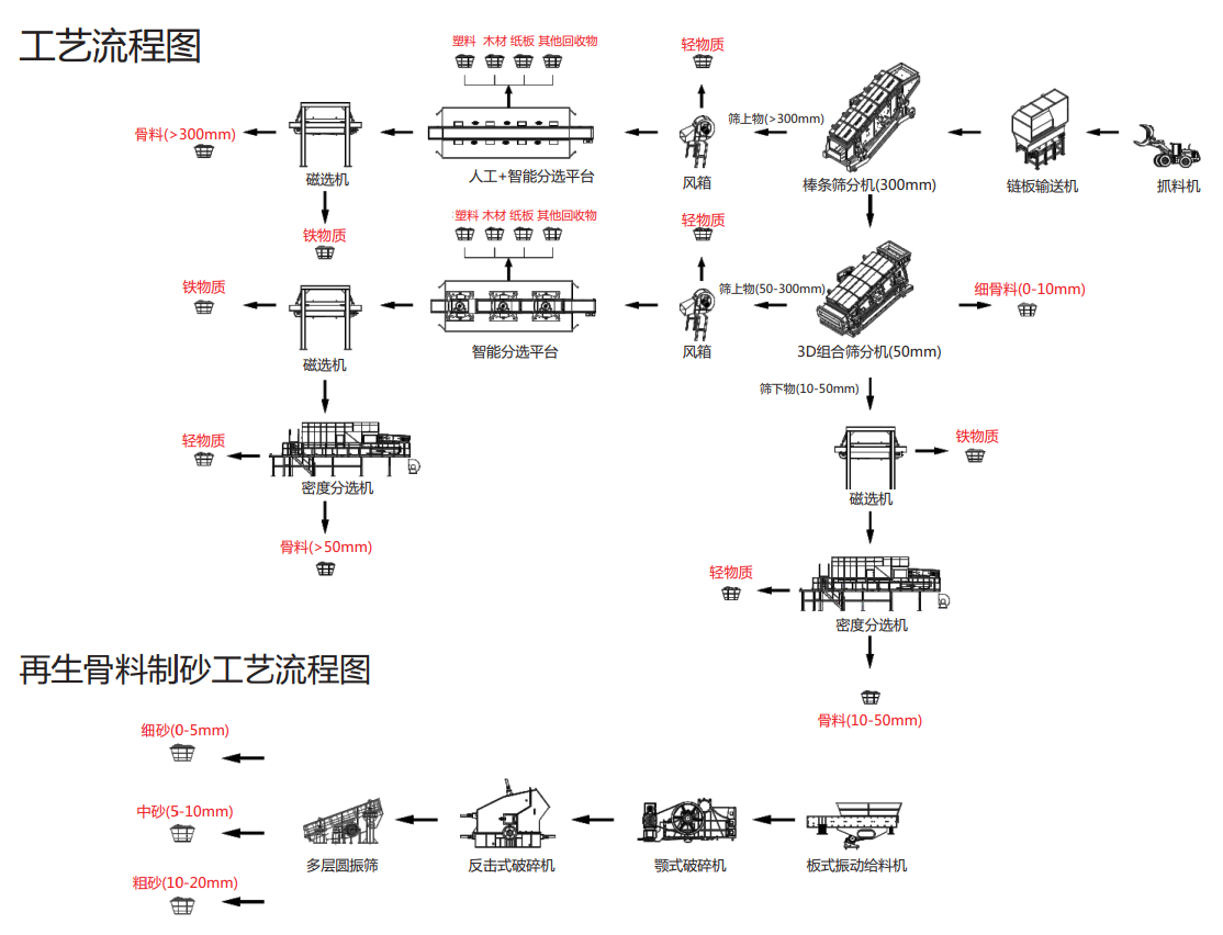 斯瑞德建筑裝修垃圾預(yù)處理方案利用不同的振動(dòng)篩、馳張篩組成篩分系統(tǒng),將裝修垃圾按照尺寸進(jìn)行篩分,從而獲得不同尺寸的粉料、骨料;通過(guò)人工分選、智能分選、磁選等分選流程,回收紙板、廢舊金屬、塑料、木材等再生資源;采用風(fēng)選篩分出可以制造RDF的輕質(zhì)物料,實(shí)現(xiàn)裝修垃圾的價(jià)值最大化。