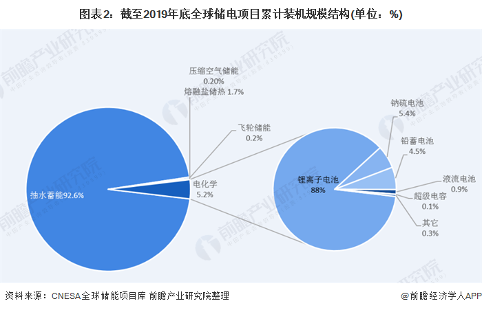 2019年全球儲(chǔ)電項(xiàng)目累計(jì)裝機(jī)規(guī)模結(jié)構(gòu) 抽水蓄能占比最大