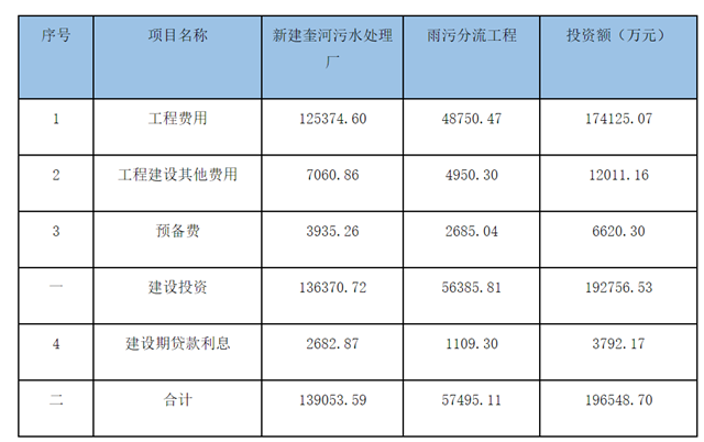 招標公告顯示,徐州市區(qū)奎河污水處理廠及金山大溝、姚莊大溝片區(qū)雨污分流工程PPP項目主要投資內(nèi)容為新建奎河污水處理廠及金山大溝、姚莊大溝片區(qū)雨污分流工程,總投資概算196548.70萬元。其中新建奎河污水處理廠服務范圍約52.23km2,為全地下式污水處理廠,處理規(guī)模為20萬m3/d,投資概算為139053.59萬元;雨污分流工程包含2個排水片區(qū)的新建雨水工程、新建污水工程、合流管涵改雨水管工程、合流管涵改污水管工程、老小區(qū)雨污分流工程、初雨控制工程和奎河截污管修復、新建工程,投資概算為57495.11萬元。具體項目投資概算表如下: