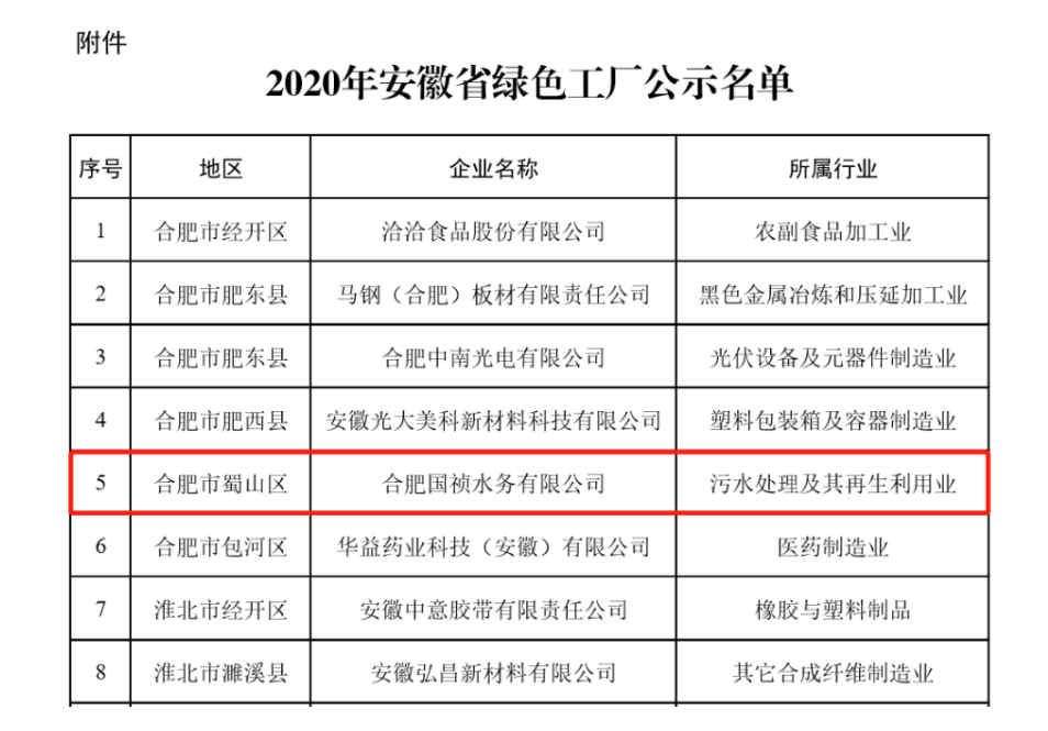 8月25日,安徽省經(jīng)濟(jì)和信息化廳“2020年安徽省綠色工廠擬評(píng)價(jià)名單”公示結(jié)束,國(guó)禎環(huán)保合肥市清溪凈水廠榮獲省級(jí)“綠色工廠”榮譽(yù)稱號(hào)。