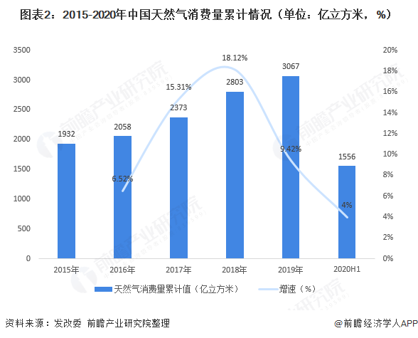 天然氣需求方面,近年來,我國天然氣的消費量保持增長趨勢,但增速趨緩。據(jù)發(fā)改委數(shù)據(jù),2019年我國天然氣消費量累計達3067億立方米,同比增長9.42%,增速降幅較大,達到約9個百分點,主要是宏觀經(jīng)濟轉型導致能源消費增速下行。2020年上半年達到1556億立方米,同比增長4%。