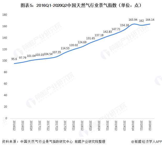 雖然2020年以來液化天然氣價格持續(xù)走低,但是由于天然氣屬于穩(wěn)定的清潔資源,未來的發(fā)展空間依舊較大。發(fā)展“建筑節(jié)能”和可再生資源,是國家能源發(fā)展的必經(jīng)之路。據(jù)中國天然氣行業(yè)景氣指數(shù)研究中心,2016Q1-2020Q2中國天然氣行業(yè)景氣指數(shù)不斷提高, 2020年第二季度達到164.14點。