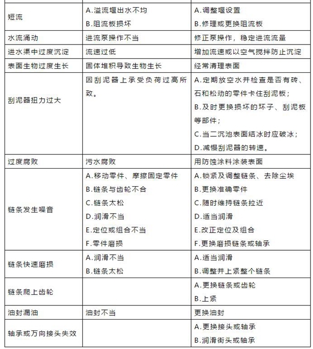 6、定期(一般每年一次)將二沉池放空檢修,重點(diǎn)檢查水下設(shè)備、管道、池底與設(shè)備的配合等是否出現(xiàn)異常,并根據(jù)具體情況進(jìn)行修復(fù)。