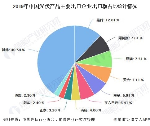 出口企業(yè)方面,出口前十企業(yè)的光伏產(chǎn)品出口額約為123.8億美元,占光伏產(chǎn)品出口總額的59.6%,較2018年下降2.2個百分點。出口額超過10億美元的企業(yè)達(dá)到6家,分別為晶科能源、阿特斯、晶澳科技、天合光能、隆基綠能、東方日升,較2018年增加2家。晶科能源以12.01%占比排名第一,阿特斯和晶澳科技緊隨其后,出口金額占比分別為7.61%和7.51%。