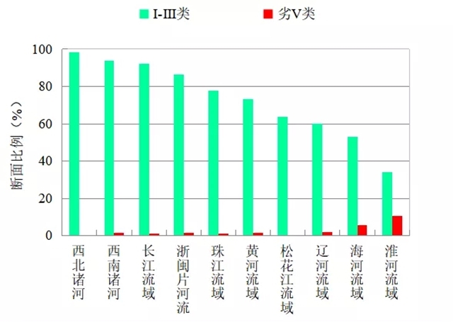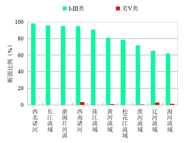 2020年1-8月,長江、黃河、珠江、松花江、淮河、海河、遼河等七大流域及西北諸河、西南諸河和浙閩片河流Ⅰ-Ⅲ類水質(zhì)斷面比例為84.9%,同比上升6.7個百分點;劣Ⅴ類為0.6%,同比下降3.6個百分點。主要污染指標為化學需氧量、高錳酸鹽指數(shù)和五日生化需氧量。其中,西北諸河、長江流域、浙閩片河流、西南諸河和珠江流域水質(zhì)為優(yōu),黃河和松花江流域水質(zhì)良好,淮河、遼河和海河流域為輕度污染。