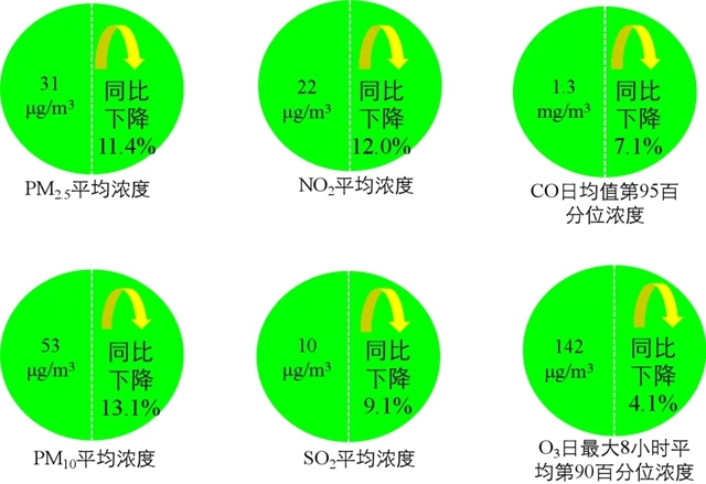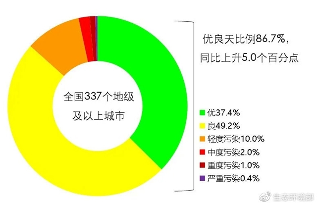 1-8月,全國337個地級及以上城市平均優(yōu)良天數(shù)比例為86.7%,同比上升5.0個百分點;PM2.5濃度為31微克/立方米,同比下降11.4%;PM10濃度為53微克/立方米,同比下降13.1%;O3濃度為142微克/立方米,同比下降4.1%;SO2濃度為10微克/立方米,同比下降9.1%;NO2濃度為22微克/立方米,同比下降12.0%;CO濃度為1.3毫克/立方米,同比下降7.1%。