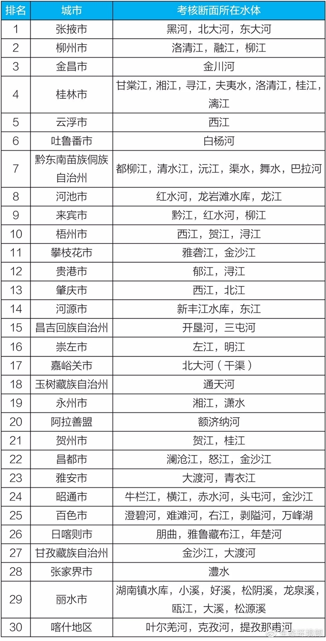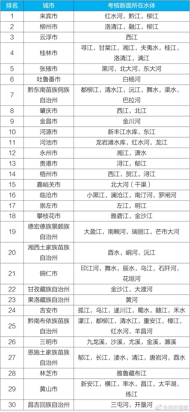參加排名的全國地級及以上城市,覆蓋2050個國控斷面(其中1940個為國家地表水考核斷面,110個為入??刂茢嗝?。2020年8月,全國地級及以上城市中,來賓、柳州和云浮等30個城市國家地表水考核斷面水環(huán)境質(zhì)量相對較好(從第1名至第30名),菏澤、滄州和商丘等30個城市國家地表水考核斷面水環(huán)境質(zhì)量相對較差(從倒數(shù)第1名至倒數(shù)第30名);2020年1-8月,全國地級及以上城市中,張掖、柳州和金昌等30個城市國家地表水考核斷面水環(huán)境質(zhì)量相對較好(從第1名至第30名),銅川、滄州和邢臺等30個城市國家地表水考核斷面水環(huán)境質(zhì)量相對較差(從倒數(shù)第1名至倒數(shù)第30名)。詳細見附表1~附表4。