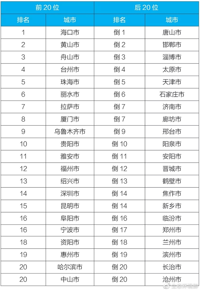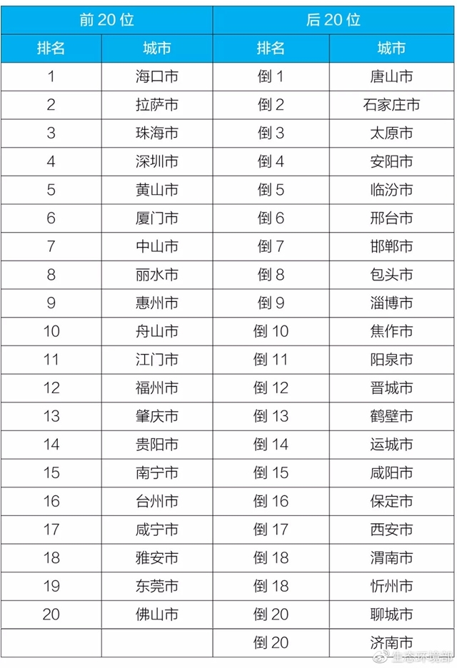 2020年8月168個重點城市環(huán)境空氣排名前20位和后20位城市名單?