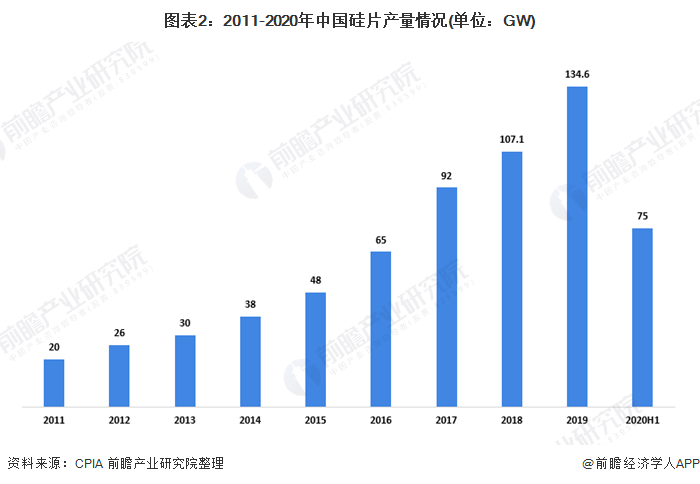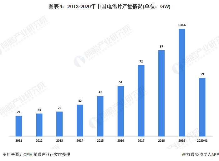 2019年我國電池片產(chǎn)量為108.6GW,同比增長27.8%。2020年上半年,電池片產(chǎn)量達(dá)到59GW,同比增長15.7%。其中,PERC黑硅多晶電池片平均轉(zhuǎn)換效率達(dá)到20.6%;PERC單晶電池片平均轉(zhuǎn)化效率為22.4%-22.5%,最高量產(chǎn)效率接近23%。