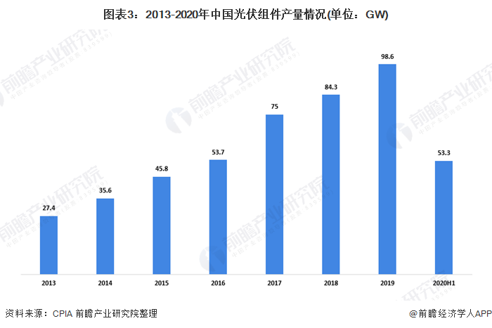 2019年,中國光伏組件產(chǎn)量達(dá)到了98.6GW,占全球產(chǎn)量比重不斷上升。2020年上半年我國光伏組件產(chǎn)量達(dá)到53.3GW,同比增加13.4%。