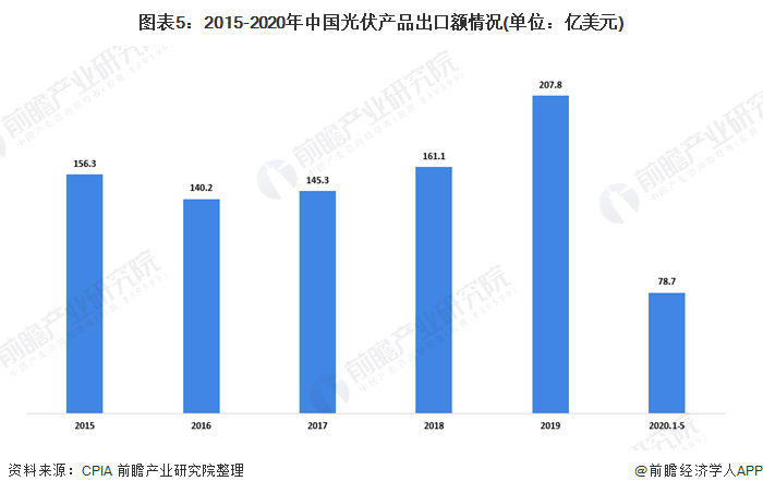 2016年以來,我國光伏主要產(chǎn)品(硅片、電池片和光伏組件)出口總額持續(xù)回升。2019年,全國光伏產(chǎn)品出口額為207.8億美元,再次突破200億美元。2020年1-5月,我國光伏產(chǎn)品出口額約為78.7億美元,同比下降10.1%。其中,硅片、電池片出口額均實(shí)現(xiàn)同比增長,其他產(chǎn)品出口額有所下降。