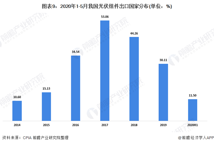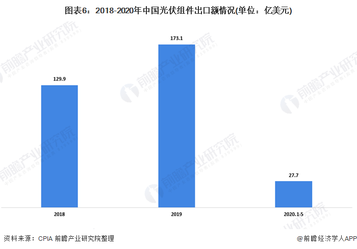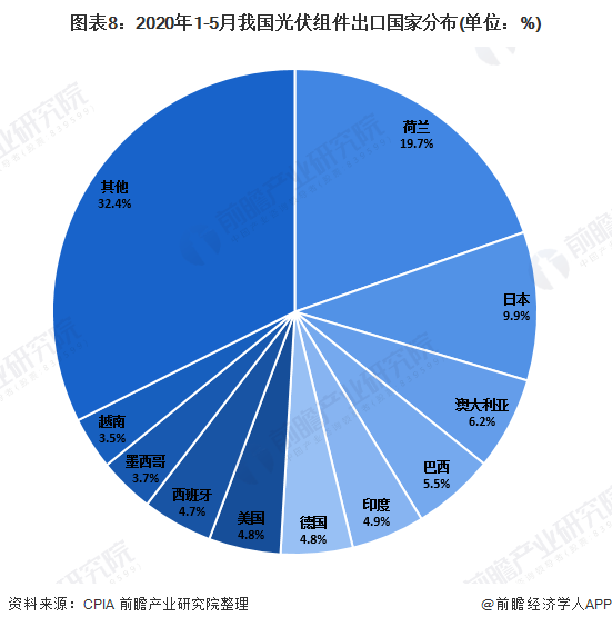 2020年1-5月,我國光伏組件出口市場中,歐洲占比進(jìn)一步增大為40%,成為最大出口區(qū)域。而美國時(shí)隔兩年再次進(jìn)去前十市場,2020年1-5月,我國對(duì)美國出口額為3.1億美元,同比增長20倍以上。
