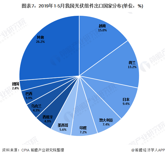 2019年我國光伏組件出口市場多元化發(fā)展,市場趨于分散。前十出口市場中亞洲國家有3個(gè),歐洲國家有4個(gè),拉美國家有2個(gè)。2020年1-5月,光伏組件出口額為27.7GW,同比下降1.8%。2020年上半年出口額在33-35GW左右。