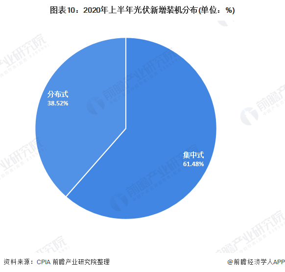 2020年上半年,在新增光伏裝機(jī)中,集中式光伏裝機(jī)新增7.07GW,占比為61.48%;分布式光伏裝機(jī)新增4.43GW,占比為38.52%。
