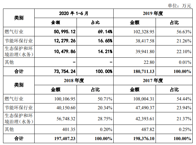 據(jù)其9月15日的申報(bào)稿顯示,公司主營(yíng)業(yè)務(wù)板塊包括天然氣供應(yīng)及管輸運(yùn)營(yíng)業(yè)務(wù)的燃?xì)獍鍓K、水處理工程服務(wù)及膜產(chǎn)品研發(fā)生產(chǎn)銷售的水務(wù)板塊和余熱發(fā)電節(jié)能、煙氣治理的投資及工程技術(shù)服務(wù)的節(jié)能環(huán)保板塊。