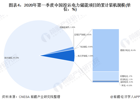 根據CNESA的數據,截至2020年第一季度,不管在全球還是在中國,抽水儲能均為主要的儲能方式,中國抽水儲能項目占比93.2%;電化學儲能為第二大儲能方式,而其中以鋰離子電池為主。截至2020年第一季度,中國電化學儲能項目中,鋰離子電池占比81.4%。