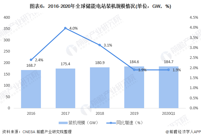 截至2020年3月底,全球已投運電力儲能項目(含物理儲能、電化學儲能以及熔融鹽儲熱)的累計裝機規(guī)模達184.7GW,同比增長1.9%。