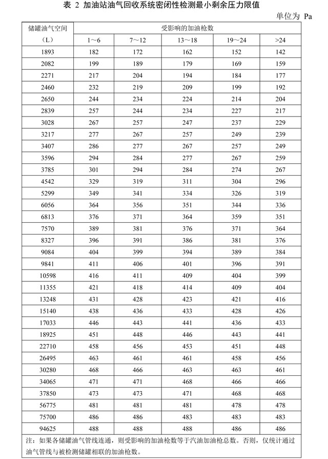 密閉性限值執(zhí)行GB20952標(biāo)準(zhǔn)規(guī)定,油氣回收系統(tǒng)密閉性壓力檢測值應(yīng)大于等于表2規(guī)定的最小剩余壓力限值。