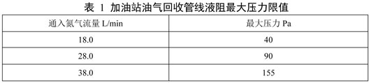 液阻限值執(zhí)行GB20952標(biāo)準(zhǔn)規(guī)定,加油油氣回收管線液阻檢測值應(yīng)小于表1規(guī)定的最大壓力限值。