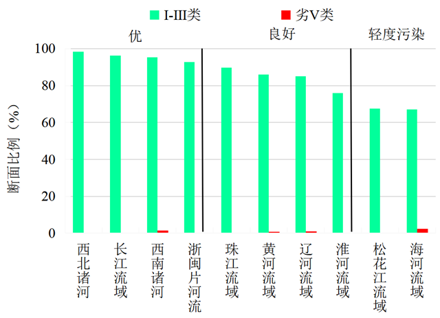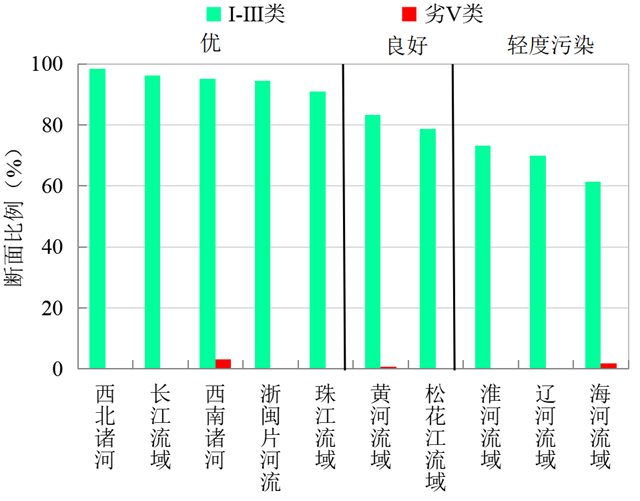 圖3 2020年10月七大流域和西南、西北諸河及浙閩片河流水質類別比例