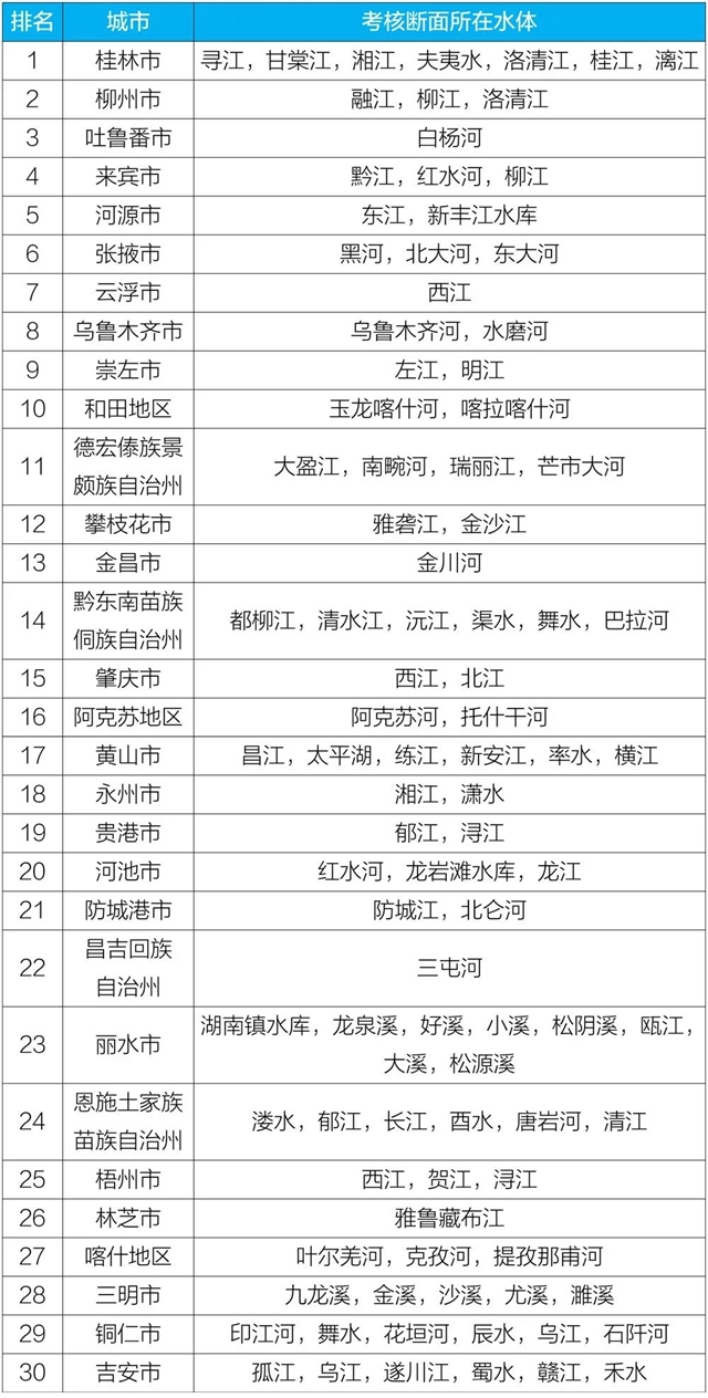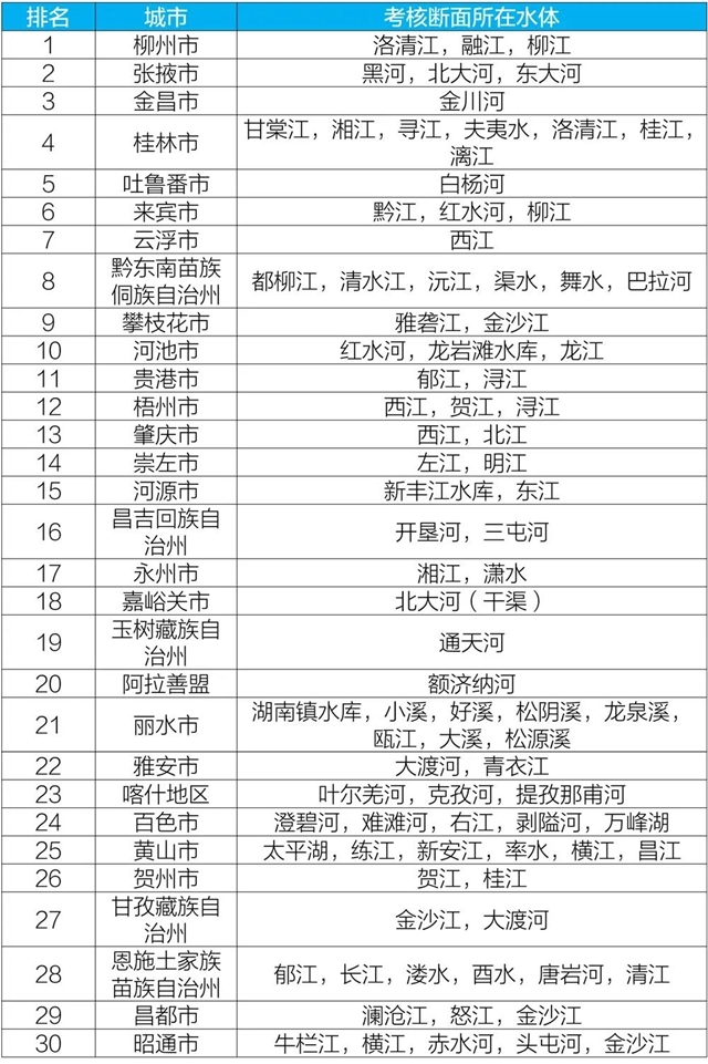 參加排名的全國地級及以上城市,覆蓋2050個國控斷面(其中1940個為國家地表水考核斷面,110個為入??刂茢嗝?。2020年10月,全國地級及以上城市中,桂林、柳州和吐魯番等30個城市國家地表水考核斷面水環(huán)境質量相對較好(從第1名至第30名),滄州、商丘和聊城等30個城市國家地表水考核斷面水環(huán)境質量相對較差(從倒數(shù)第1名至倒數(shù)第30名);2020年1-10月,全國地級及以上城市中,柳州、張掖和金昌等30個城市國家地表水考核斷面水環(huán)境質量相對較好(從第1名至第30名),銅川、滄州和邢臺等30個城市國家地表水考核斷面水環(huán)境質量相對較差(從倒數(shù)第1名至倒數(shù)第30名)。詳細見附表1~附表4。