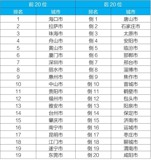 1-10月,168個重點城市中,唐山、石家莊和太原市等城市空氣質量相對較差(從倒數(shù)第1名至倒數(shù)第20名);??凇⒗_和珠海市等城市空氣質量相對較好(從第1名至并列第19名),見附表6。