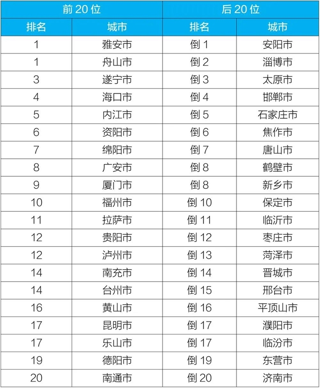 10月,168個重點城市中,安陽、淄博和太原市等城市空氣質量相對較差(從倒數(shù)第1名至倒數(shù)第20名);雅安、舟山和遂寧市等城市空氣質量相對較好(從第1名至第20名),見附表5。