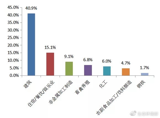 從行業(yè)類型來看,10月公眾反映最集中的行業(yè)為建筑業(yè),占40.9%;其次為住宿餐飲娛樂業(yè)和非金屬加工制造業(yè),分別占15.1%和9.1%。其中,建筑業(yè)占比比9月同類占比增加1.8%;非金屬加工制造業(yè)舉報(bào)占比比9月同類占比增加2.1%;住宿餐飲娛樂業(yè)舉報(bào)占比比9月同類占比減少0.3%,化工行業(yè)舉報(bào)占比比9月同類占比減少2.6%。