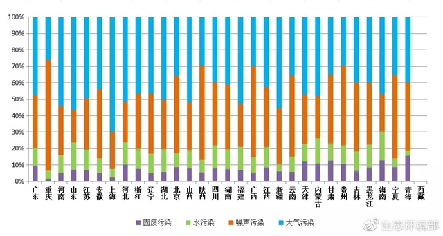 從各地區(qū)舉報(bào)污染類型占比看,上海、河南大氣污染舉報(bào)占比較高,超過全國(guó)平均水平約11個(gè)百分點(diǎn),上海主要反映油煙問題,河南主要反映惡臭異味問題。重慶、廣西噪聲污染問題在當(dāng)?shù)叵鄬?duì)突出,占比超過全國(guó)平均水平約22個(gè)百分點(diǎn),重慶主要反映建設(shè)施工噪聲污染問題,廣西主要反映工業(yè)噪聲污染問題。山東水污染舉報(bào)占比超過全國(guó)平均水平約7個(gè)百分點(diǎn),主要反映工業(yè)廢水污染問題。