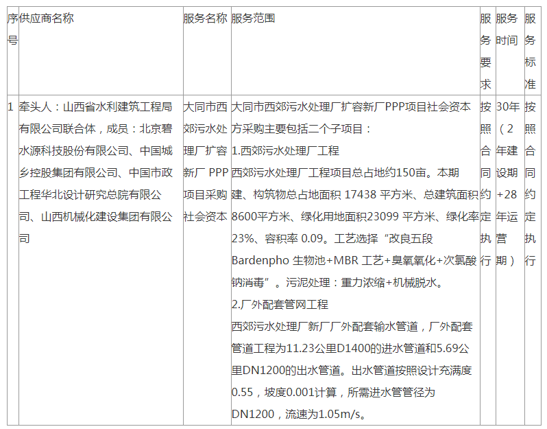 談判小組通過(guò)與評(píng)審綜合排名第一的社會(huì)資本方山西省水利建筑工程局有限公司聯(lián)合體(成員:北京碧水源科技股份有限公司、中國(guó)城鄉(xiāng)控股集團(tuán)有限公司、中國(guó)市政工程華北設(shè)計(jì)研究總院有限公司、山西機(jī)械化建設(shè)集團(tuán)有限公司),雙方達(dá)成一致意見,最終確認(rèn):