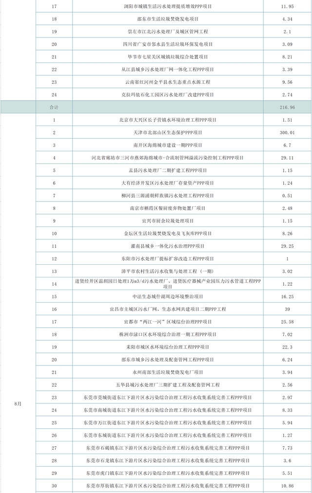4到10月期間,8月入庫的環(huán)保項(xiàng)目明顯更多,更引人注目的是其投資金額。從入庫項(xiàng)目來看,8月有46個(gè)入庫環(huán)保項(xiàng)目,東莞市東江下游片區(qū)水污染綜合治理工程污水收集系統(tǒng)完善工程PPP項(xiàng)目系列工程包攬了78.92億元的總投資額。