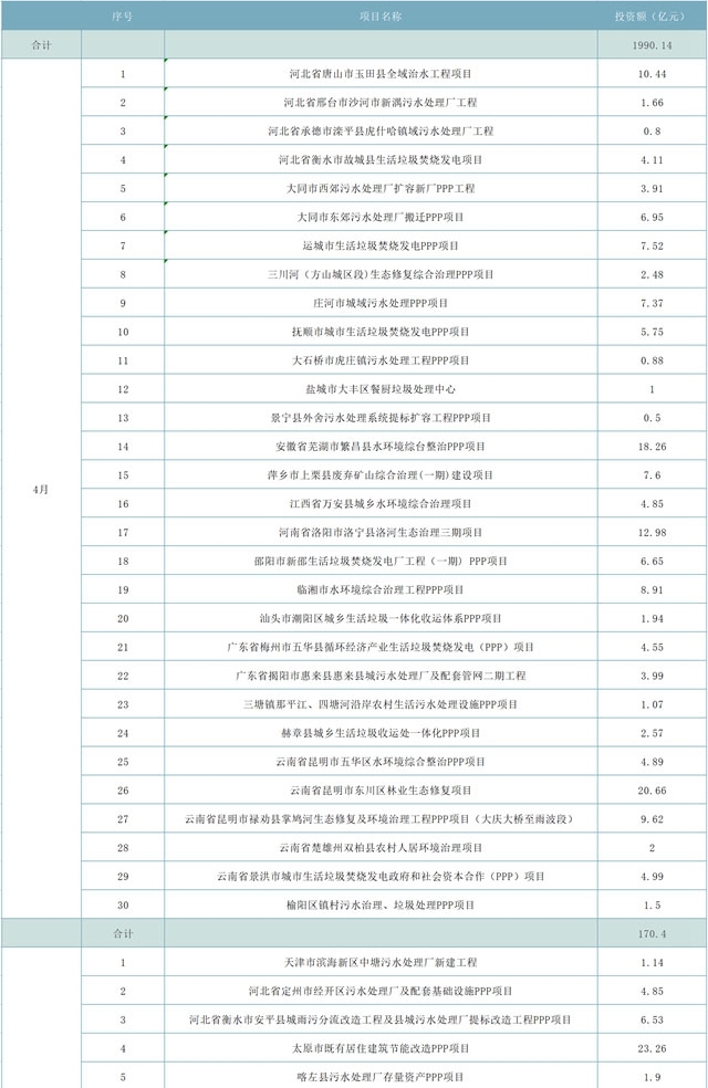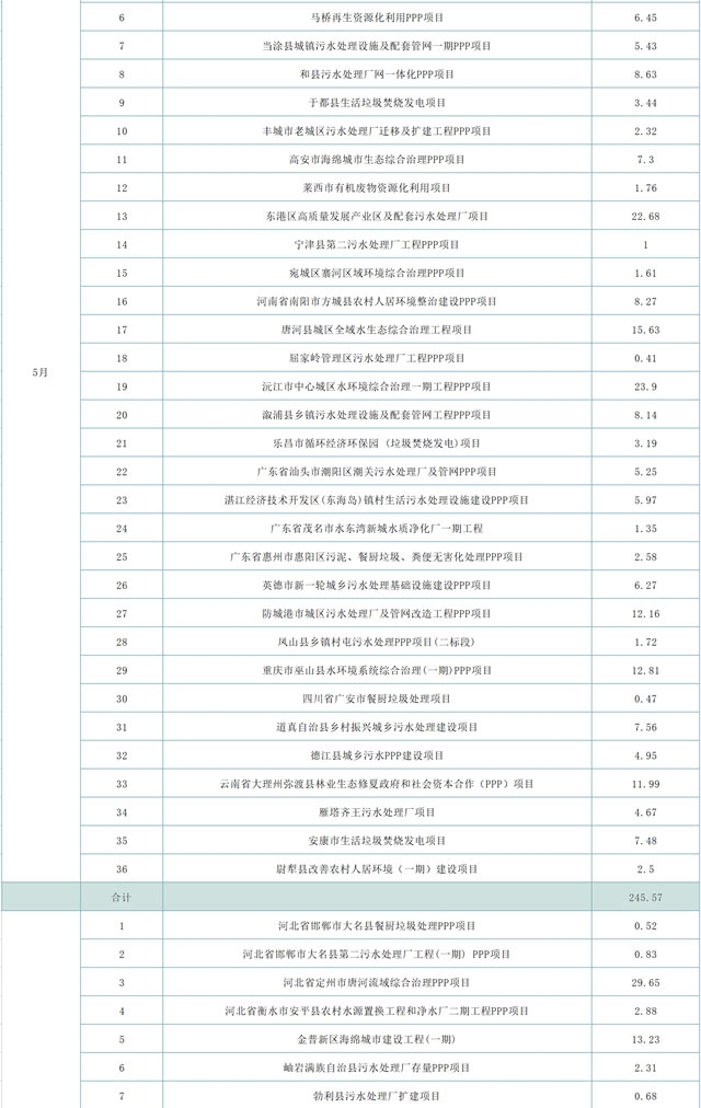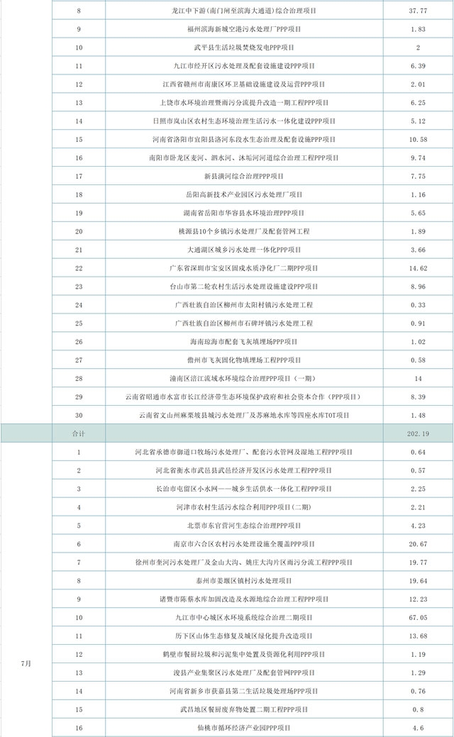 另,天津市北部山區(qū)生態(tài)保護(hù)PPP項(xiàng)目計(jì)劃投資300億元,河北省廊坊市三河市燕郊海綿城市-合流制管網(wǎng)溢流污染控制工程PPP項(xiàng)目占據(jù)29.11億元,灌南縣城鄉(xiāng)一體化污水治理PPP項(xiàng)目29.25億元,宜都市“兩江一河”區(qū)域綜臺(tái)治理PPP項(xiàng)目25.58億元,耒陽市城區(qū)水環(huán)境綜臺(tái)治理工程PPP項(xiàng)目22.3億元,江津區(qū)水環(huán)境綜合治理工程(一期) PPP項(xiàng)目達(dá)到38.92億元,這幾項(xiàng)綜合就超過了445億元。