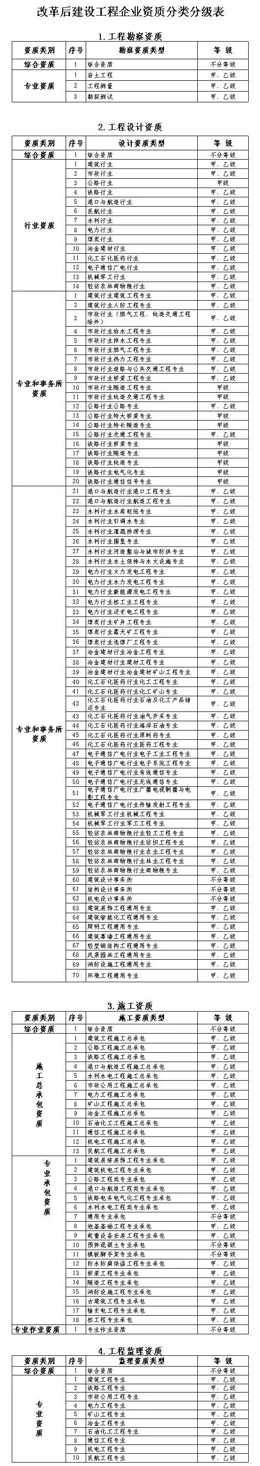 《建設(shè)工程企業(yè)資質(zhì)改革措施表》《改革后建設(shè)工程企業(yè)資質(zhì)分類(lèi)分級(jí)表》如下: