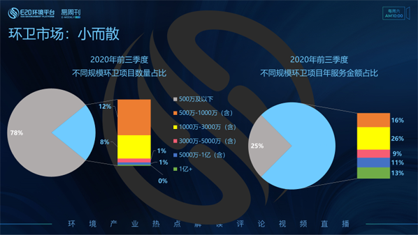 環(huán)衛(wèi)市場(chǎng)小而散的局面依舊沒有改變。2020年前三季度年服務(wù)金額在500萬(wàn)及以下的環(huán)衛(wèi)項(xiàng)目數(shù)量占整體的78%,而這78%的環(huán)衛(wèi)項(xiàng)目卻只占據(jù)環(huán)衛(wèi)市場(chǎng)份額的25%。