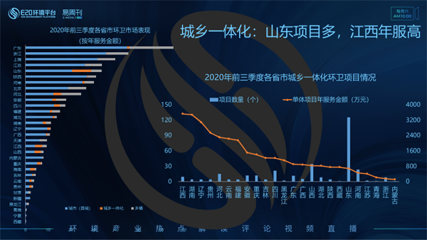 右圖為2020年前三季度各省市城鄉(xiāng)一體化環(huán)衛(wèi)項(xiàng)目中標(biāo)情況,從中標(biāo)的項(xiàng)目數(shù)量維度看,排名前三的省份分別為:山東省、山西省與河南省。但從單體環(huán)衛(wèi)項(xiàng)目的年服務(wù)金額排名看,平均年服務(wù)金額較大的前三省份分別為:江西省、湖南省和遼寧省。