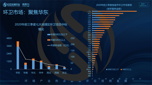 從七大地理區(qū)維度進(jìn)行劃分(左圖),2020年前三季度環(huán)衛(wèi)項(xiàng)目數(shù)量釋放最多的地理區(qū)為一向是環(huán)衛(wèi)市場(chǎng)化的第一陣營(yíng)的華東地區(qū);其次為華北和華中地區(qū)。按年服務(wù)金額排名前三的地區(qū)分別為:華東地區(qū)、華南地區(qū)和華北地區(qū)。