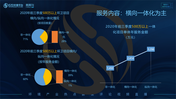 左下圖,2020年前三季度500萬(wàn)以上環(huán)衛(wèi)項(xiàng)目橫縱向一體化情況,按照年服務(wù)金額劃分,可以看到非一體化環(huán)衛(wèi)項(xiàng)目所占市場(chǎng)份額約60%,橫向、縱向一體化環(huán)衛(wèi)項(xiàng)目的年服務(wù)金額總額占到整體份額的40%。