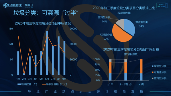 右下圖為2020年前三季度垃圾分類項(xiàng)目年限分布(按項(xiàng)目數(shù)量),宣傳型垃圾分類項(xiàng)目的服務(wù)年限主要集中在3年以下,3年以上的較長(zhǎng)服務(wù)時(shí)間的垃圾分類項(xiàng)目采用可溯源分類模式的占比較大。