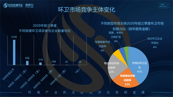 E20研究院對(duì)每家環(huán)衛(wèi)企業(yè)的來(lái)源都進(jìn)行分類和貼標(biāo)簽,大致分為市場(chǎng)化環(huán)衛(wèi)企業(yè)、物業(yè)保潔市場(chǎng)化延伸、市政綠化市場(chǎng)化延伸、車輛裝備市場(chǎng)化延伸、地方環(huán)衛(wèi)企業(yè)市場(chǎng)化和固廢、水務(wù)A方陣擴(kuò)張。右圖為不同類型市場(chǎng)主體前三季度環(huán)衛(wèi)市場(chǎng)份額占比,其中占比最高(41%)的是市場(chǎng)化環(huán)衛(wèi)企業(yè);其次為市政綠化市場(chǎng)化延伸及物業(yè)保潔市場(chǎng)化延伸類企業(yè)所獲市場(chǎng)份額較多,占比分別為23%和22%。