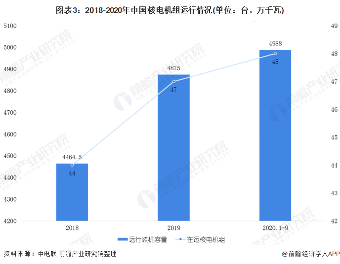 截至2019年底,中國在運(yùn)核電機(jī)組共47臺(tái),分別位于8個(gè)沿海省份的13個(gè)核電基地中,運(yùn)行裝機(jī)容量達(dá)到4875萬千瓦,位居世界第三,占全國總裝機(jī)容量的2.5%左右。截止2020年9月底,中國在運(yùn)核電機(jī)組48臺(tái),總裝機(jī)容量4988萬千瓦。